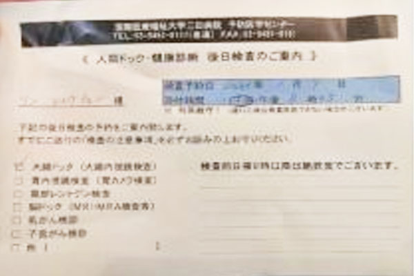李女士通过朋友介绍,联系到日本飞跃医疗服务公司的体检负责人,由于本次想带父母去日本做一次全面的检查,李女士已经咨询过其他多家医疗中介公司,没有找到李女士满意的答案。最后在体检总负责人的提案下,决定在三田医院做综合检查三天套餐。